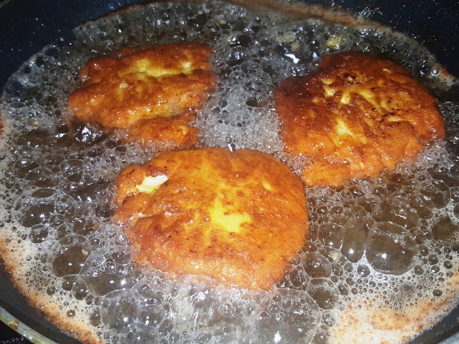 - Bucatile de piept de pui se trec prin compozitie, apoi se prajesc in ulei incins, cateva minute pe fiecare parte.